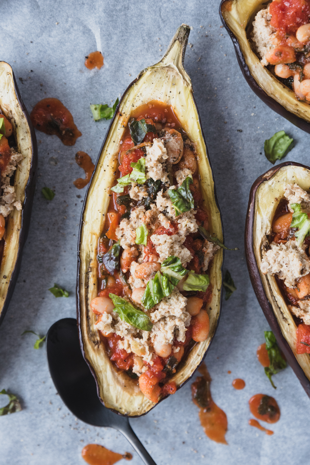 Umso besser, da ist die Inspiration ja dann doch am größten und so sind diese gefüllten Auberginen mit weißen Bohnen und Tomatensoße entstanden. Soll ich dir was sagen? Ich liebe gefülltes Gemüse! Ob Zucchini, Aubergine, Tomate oder Paprika. Das ist einfach noch einmal eine ganz andere Art etwas zu essen und bringt immer eine schöne Abwechslung auf den Teller.