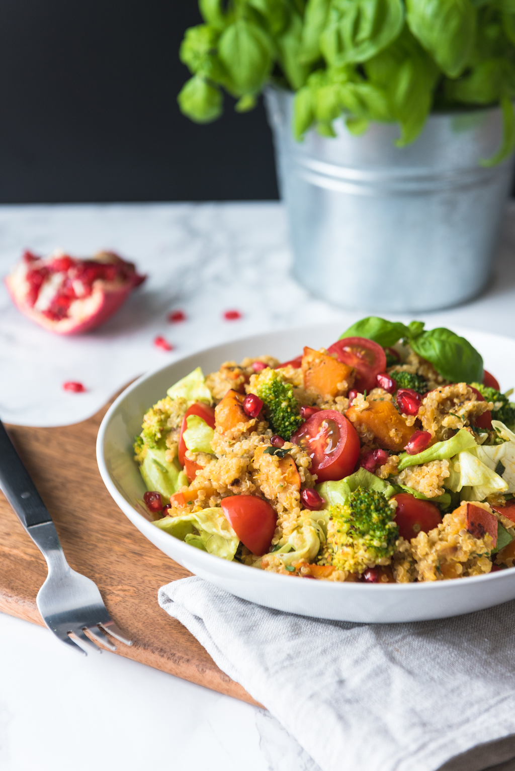 - Jetzt fülle den Quinoa in eine Schüssel um, gebe das Gemüse aus der Pfanne hinzu sowie den Salat und die Tomaten. Gieße das Dressing drüber und füge optional Granatapfelkerne hinzu.